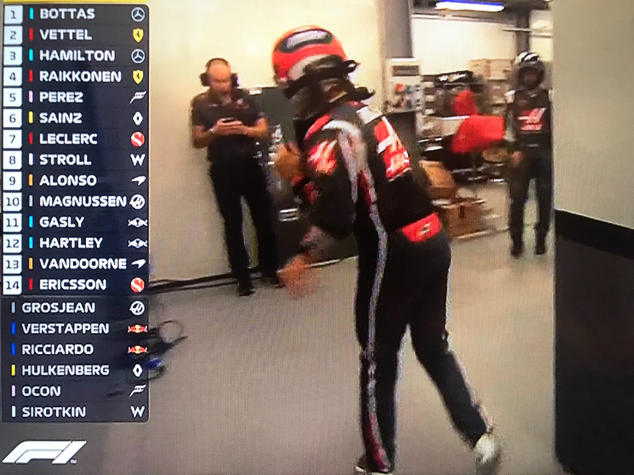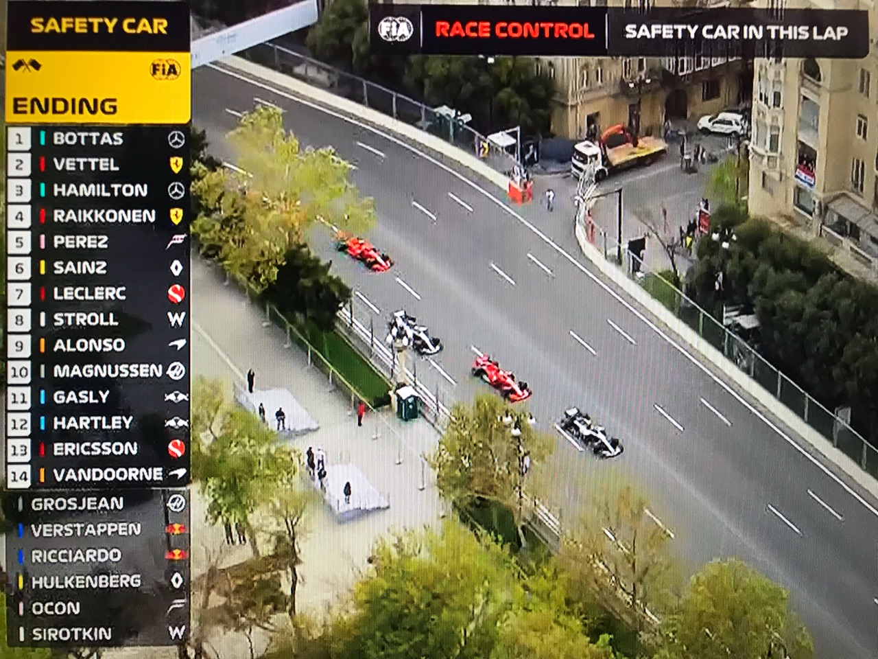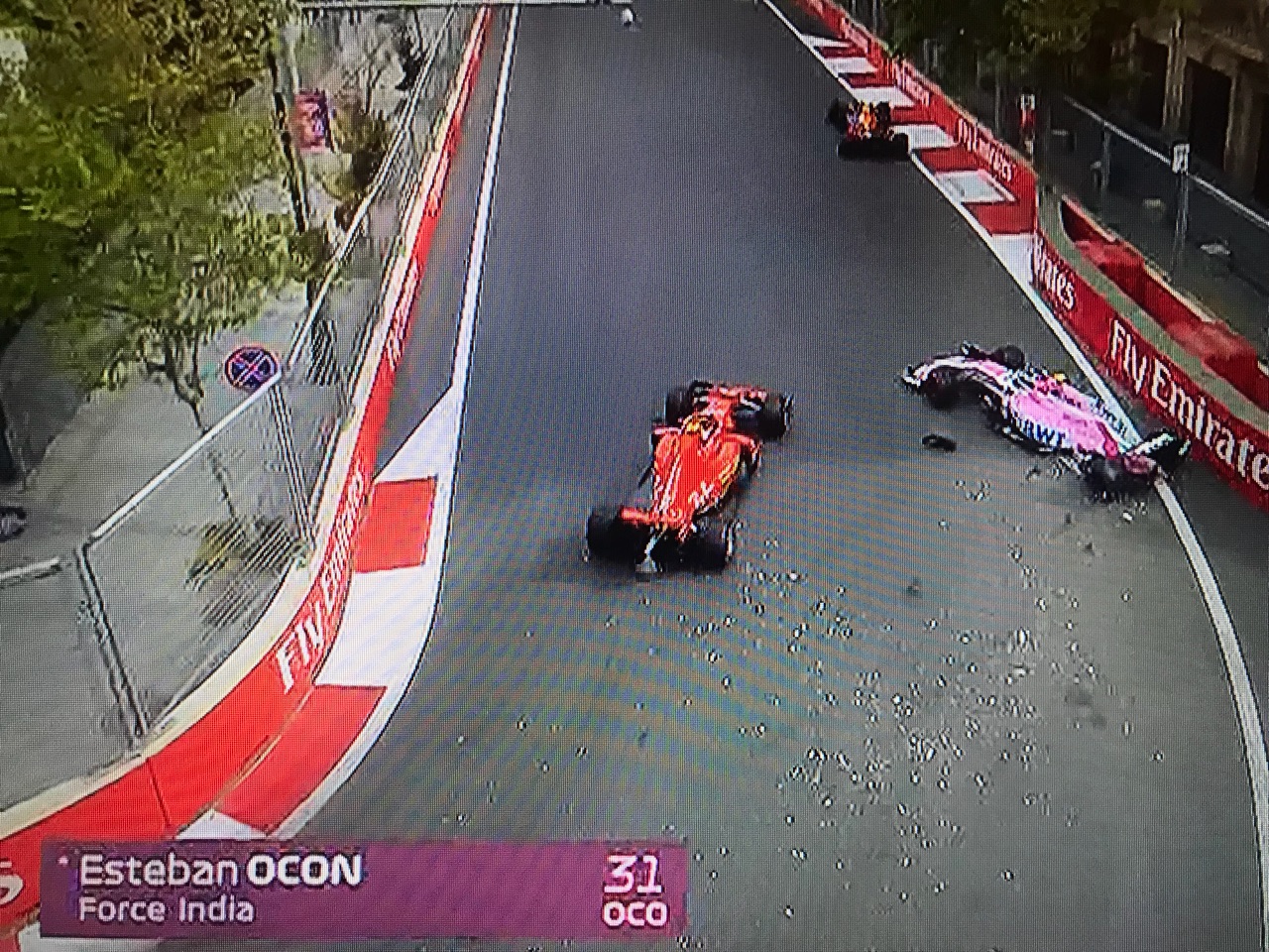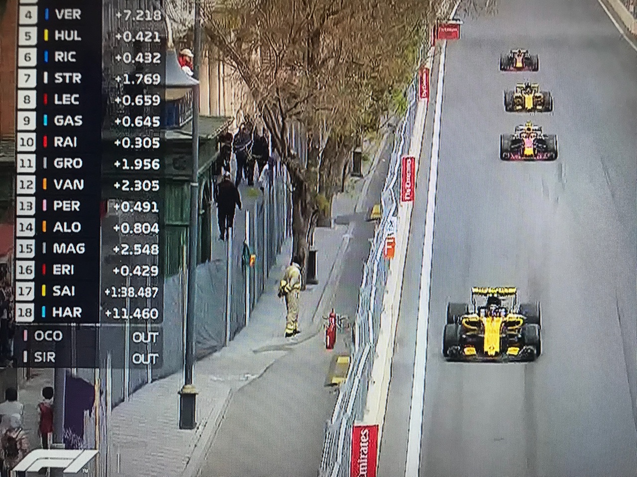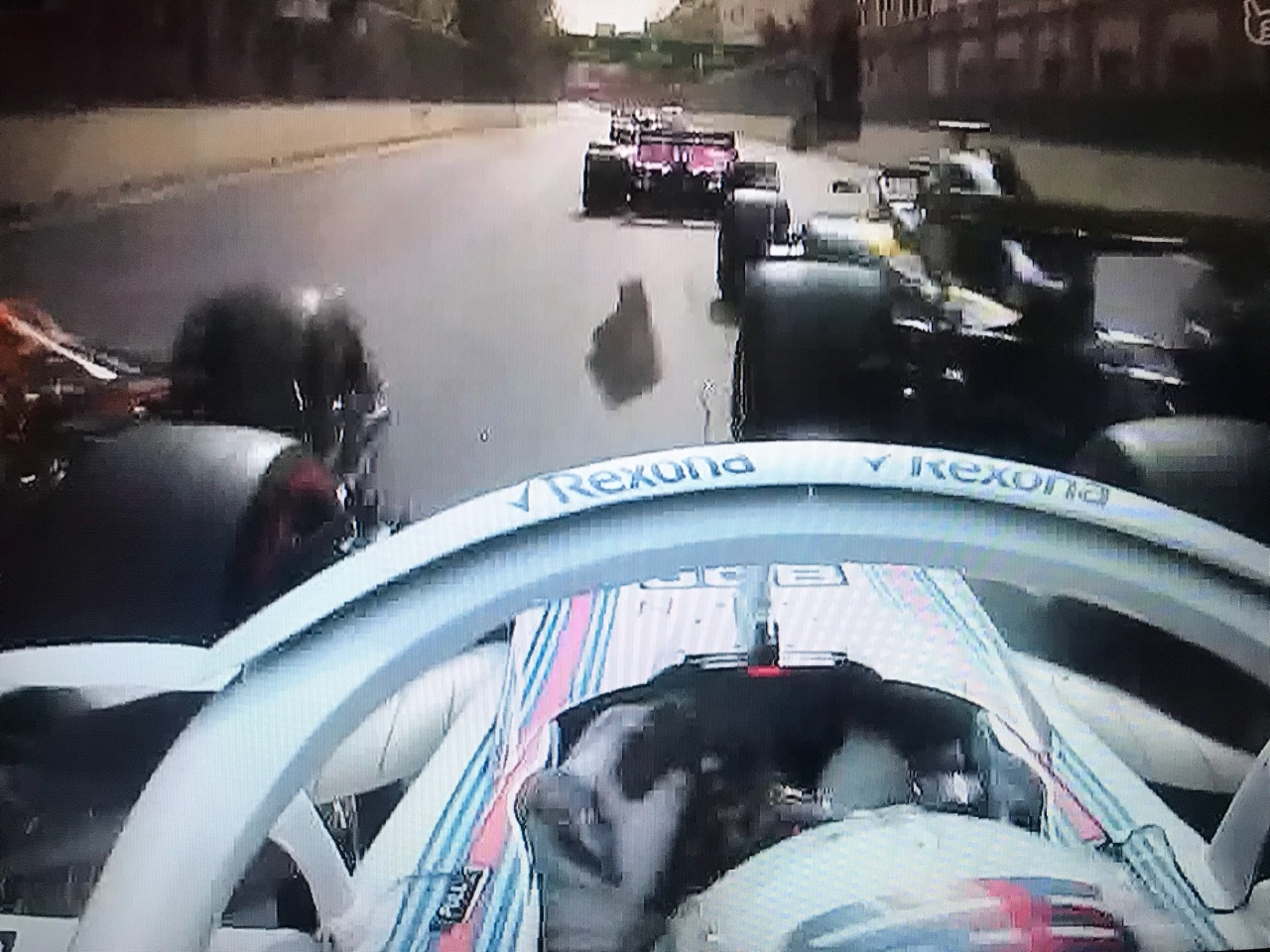 セーフティカー先導中にウォールに突き刺さるハース。予選のミスに続いて決勝も未だノーポイントの続くグロージャンがウェービングに失敗。悔しい悔しいでグローブを投げつける。これでますますセーフティカーランが延長されています。やっぱりエスケープゾーンも少ない市街地でF1をやるって、簡単なことではありませんね。