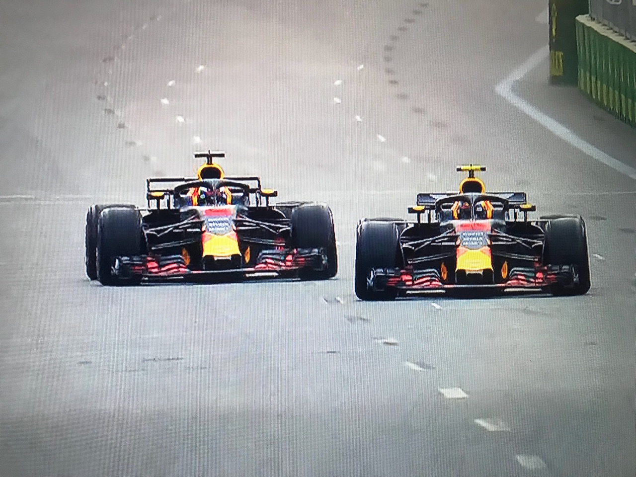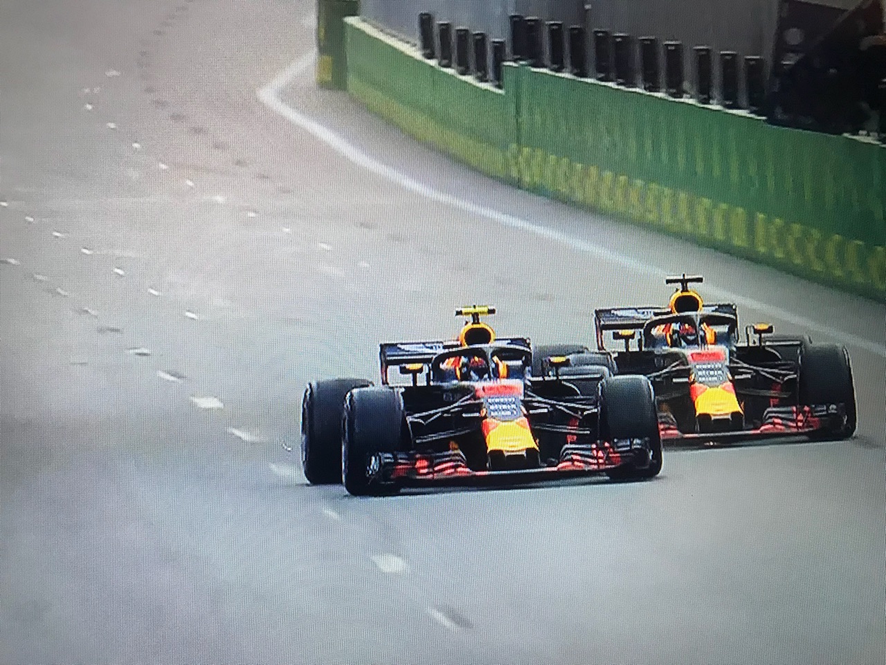 ヒュルケンベルグがいつも通り脱落し、レッドブル2人になればカリカリのバチバチです。