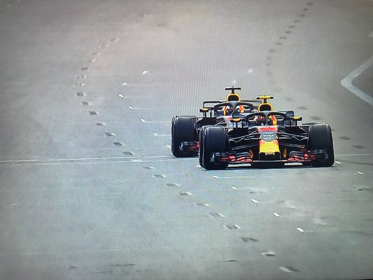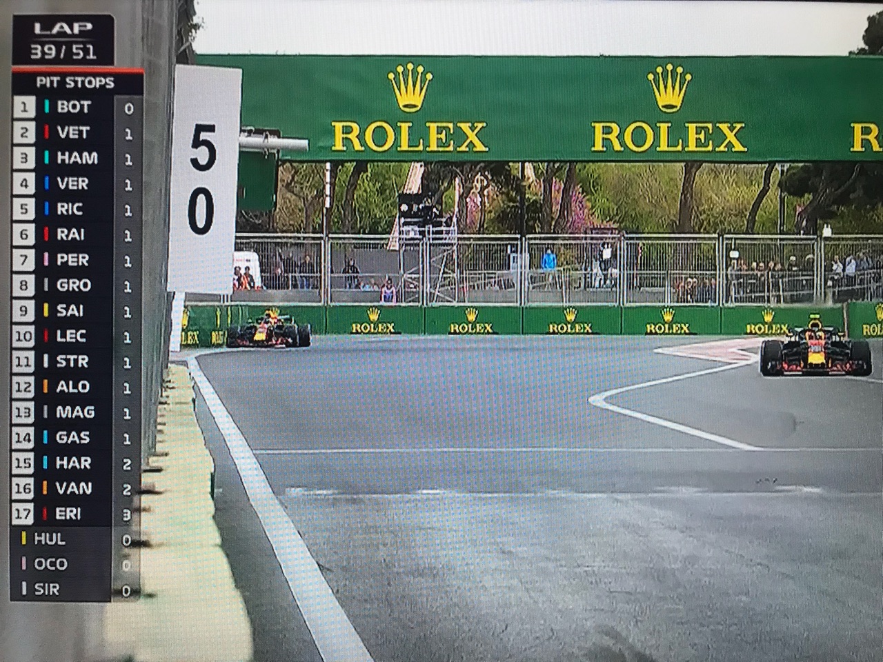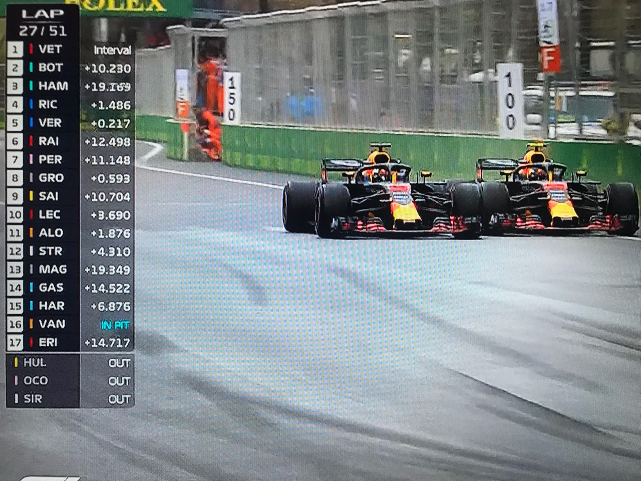 レース中盤に入ってもなかなかタイヤ交換の動きを見せず、引き続きレッドブル2台による「エースは俺だ!」決定戦が行われています。いいですね、チーム内の活性化が図れています。2人とも、近い近い近い!