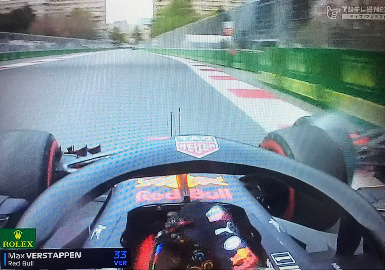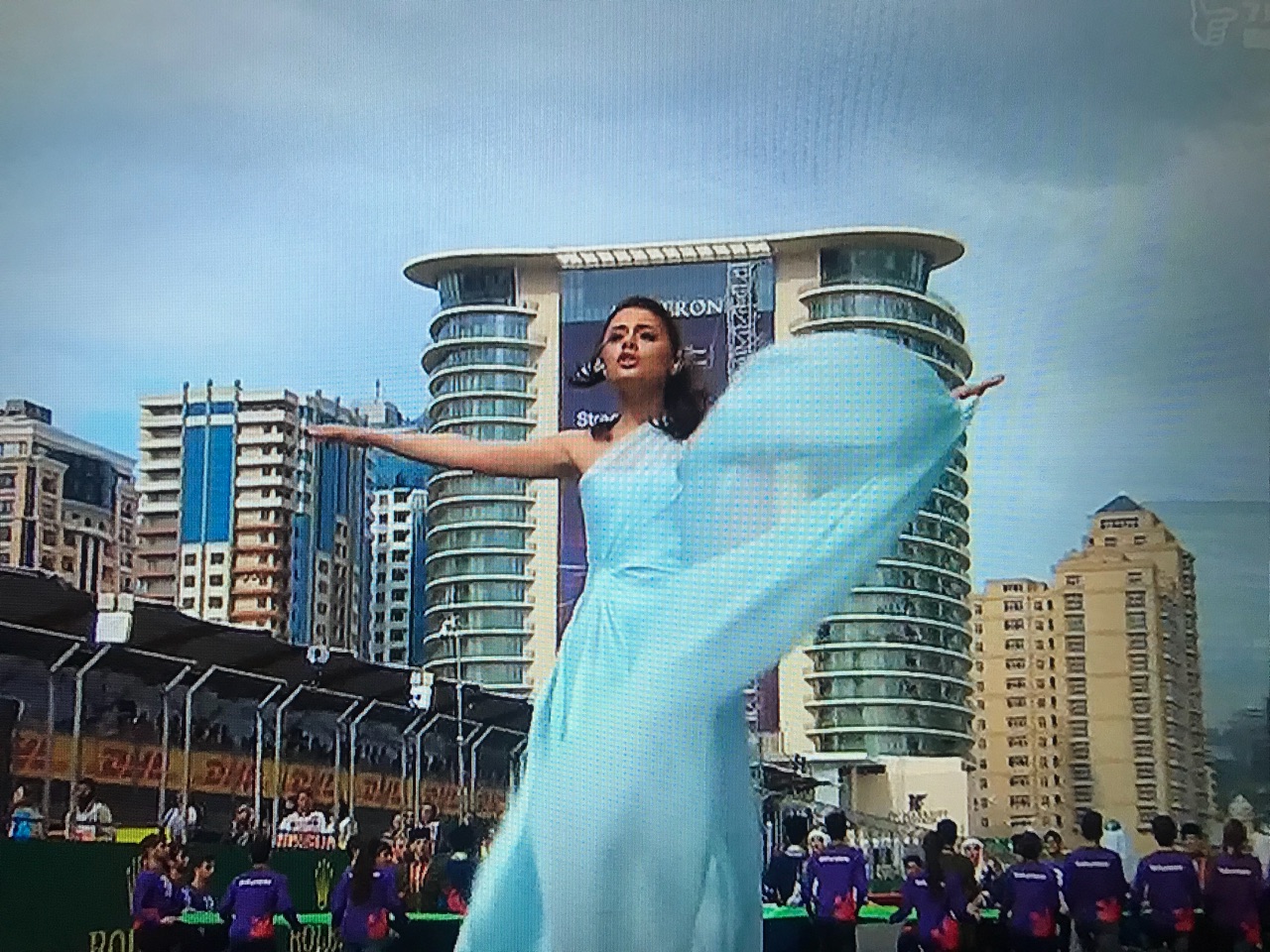 アゼルバイジャンのジュディ・オングによる国歌斉唱。まるで生き物かのように揺らぐドレス、風が強いですね。海ではないけど海並みに広い湖に面したバクー。また市街地サーキットは普段のサーキットにはあまり無いゴミや枯葉などもトラック内に散乱します。踏むのも怖いですが、各エアインテークやウィング類にまとわり付く可能性も出たりします。