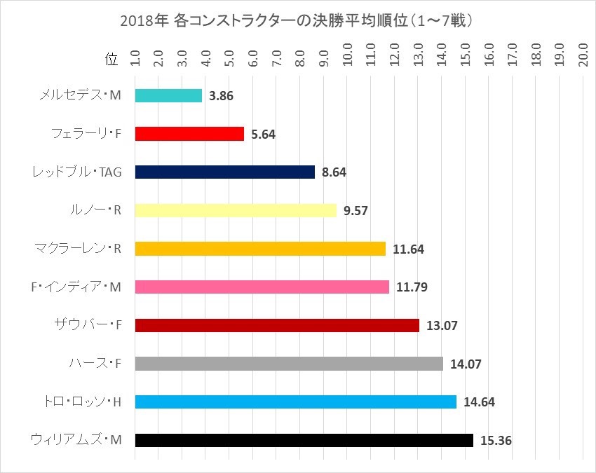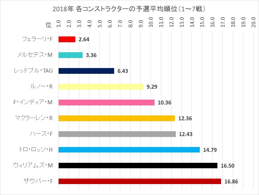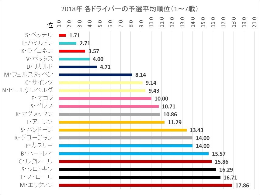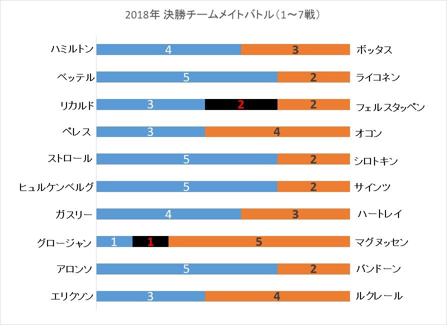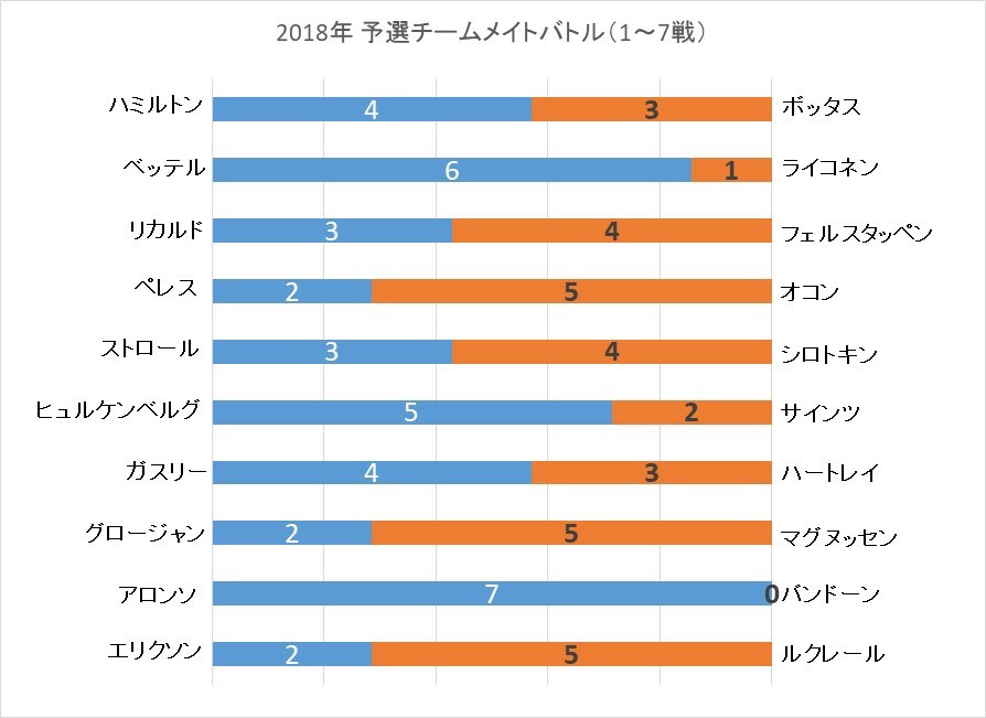 ルノーの心臓を得てそこそこ好調なマクラーレンの7-0はまあまあとして、フェラーリはチャンピオン経験者同士の6-1はヒドい。今シーズンに限ったわけではないのでさほど驚きはしませんし、決勝追い上げ型のライコネンです。予選は様子を見てみようじゃありませんか。他、特筆すべきは並なマシンと化したフォース・インディアはオコンが優勢、また最弱と思われたザウバーはルクレールが3戦目から負け無しの5回エリクソンを上回ってきています。いいですねーフェルスタッペン、オコン、ルクレール、将来のF1を背負って立てそうな若手は先輩を負かす位置につけています。