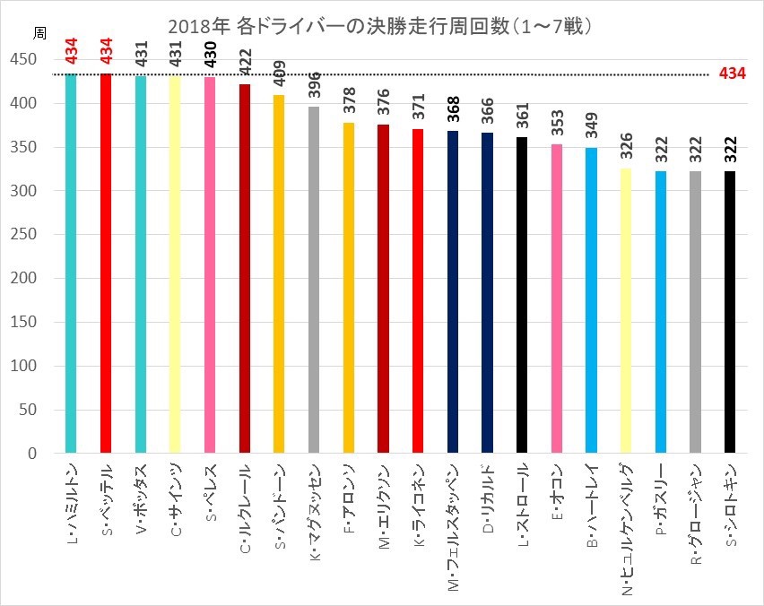 続いて決勝走行回数です。この7戦では全規定周回数をこなすと434周になります。こちらも毎回のことながら現役のツートップのみがさすがの100%消化となっています。ペレスの上位も定着してきましたね。ルクレールやバンドーンも速かれ遅かれ途中放棄少なめでちゃんと運転していますよ。一方で完走男オコンはアゼルバイジャンとスペインの2回でかましてしまっているので今シーズンは少し安定しません。最下位はグロと白金に加えてガスリーが消化率74.2%に留まる322周と並んでいます。