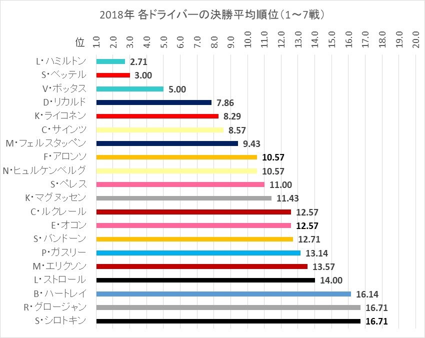 決勝になると紅の4回チャンピオンは銀の4回チャンピオンに、紅の1回チャンピオンは大きく順位を落として母国のつまらん後輩と靴呑み宴会男に食われてしまうわけです。これでは個人タイトルはあってもチームタイトルが簡単に手から離れていくわけです。こちらも後ほどグラフ化しています。フェルスタッペンあたりまでが平均10位以内の安全得点圏内、ガスリーあたりまでが運良く得点圏内、そしてエリクソン以下がトップから何周遅れで完走できるかエリアになります。このあと触れますが、ベテランのグロージャンと白い金が最下位でお揃いの16.71位で並んできます。